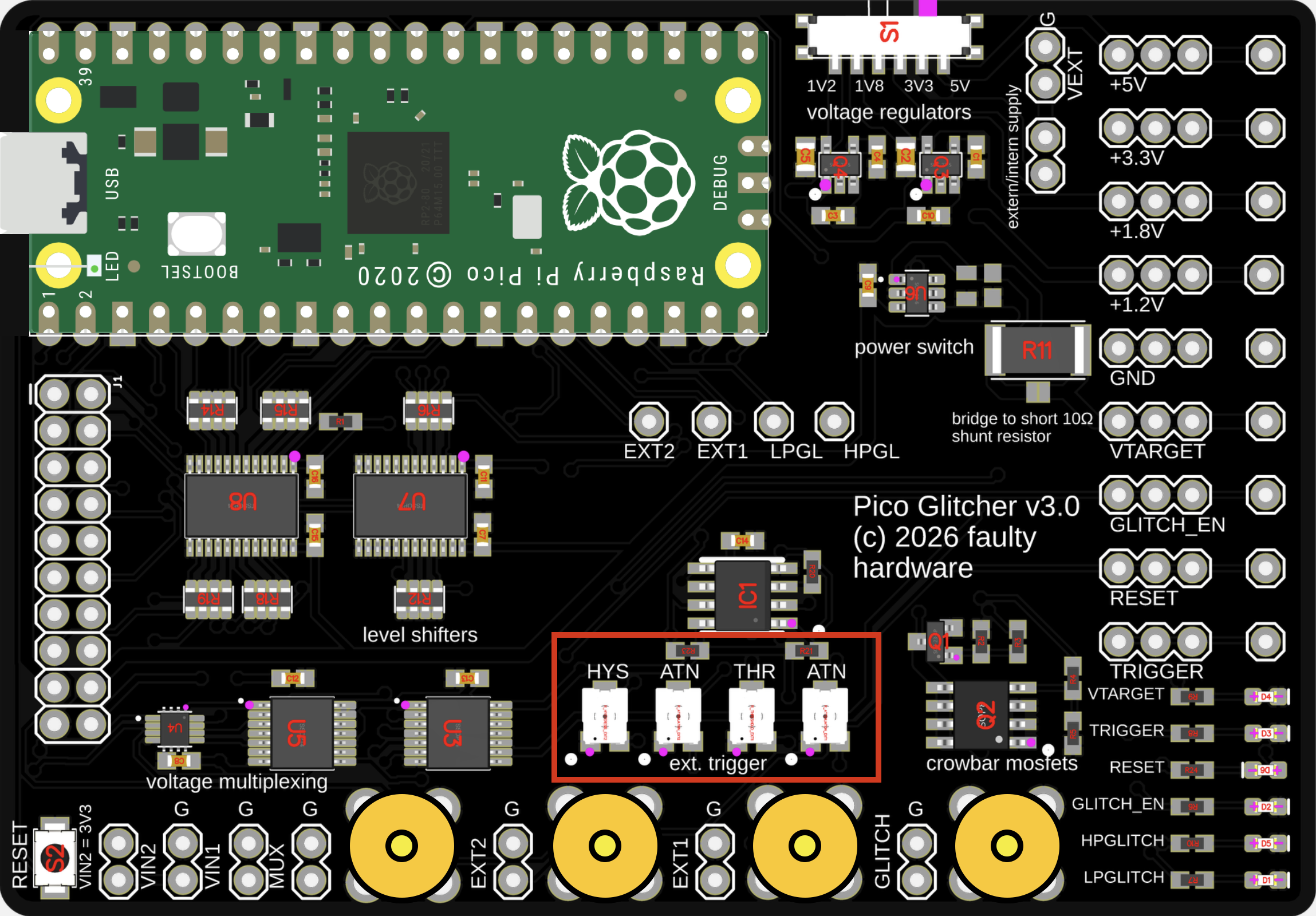 Everything else is unchanged: Two high-power MOSFETs for crowbar glitch generation, and two level shifters to ensure compatibility over a wide voltage range. An Schmitt Trigger input stage (EXT1 and EXT2) can be used to filter out noise and other disturbances via adjustable Schmitt Triggers. The multiplexing output can be used to quickly switch between up to four different voltage levels and to supply the target board with power.
