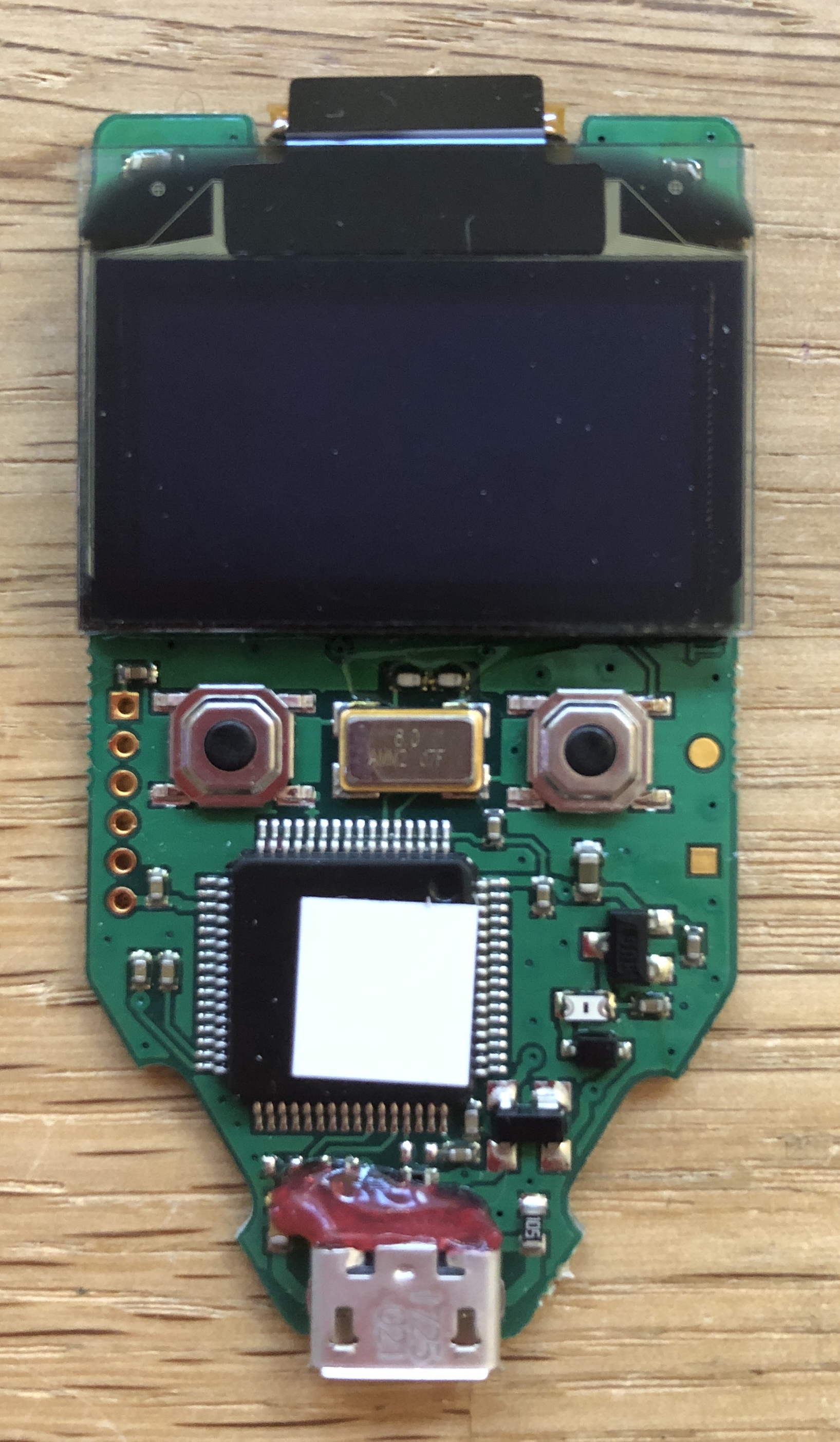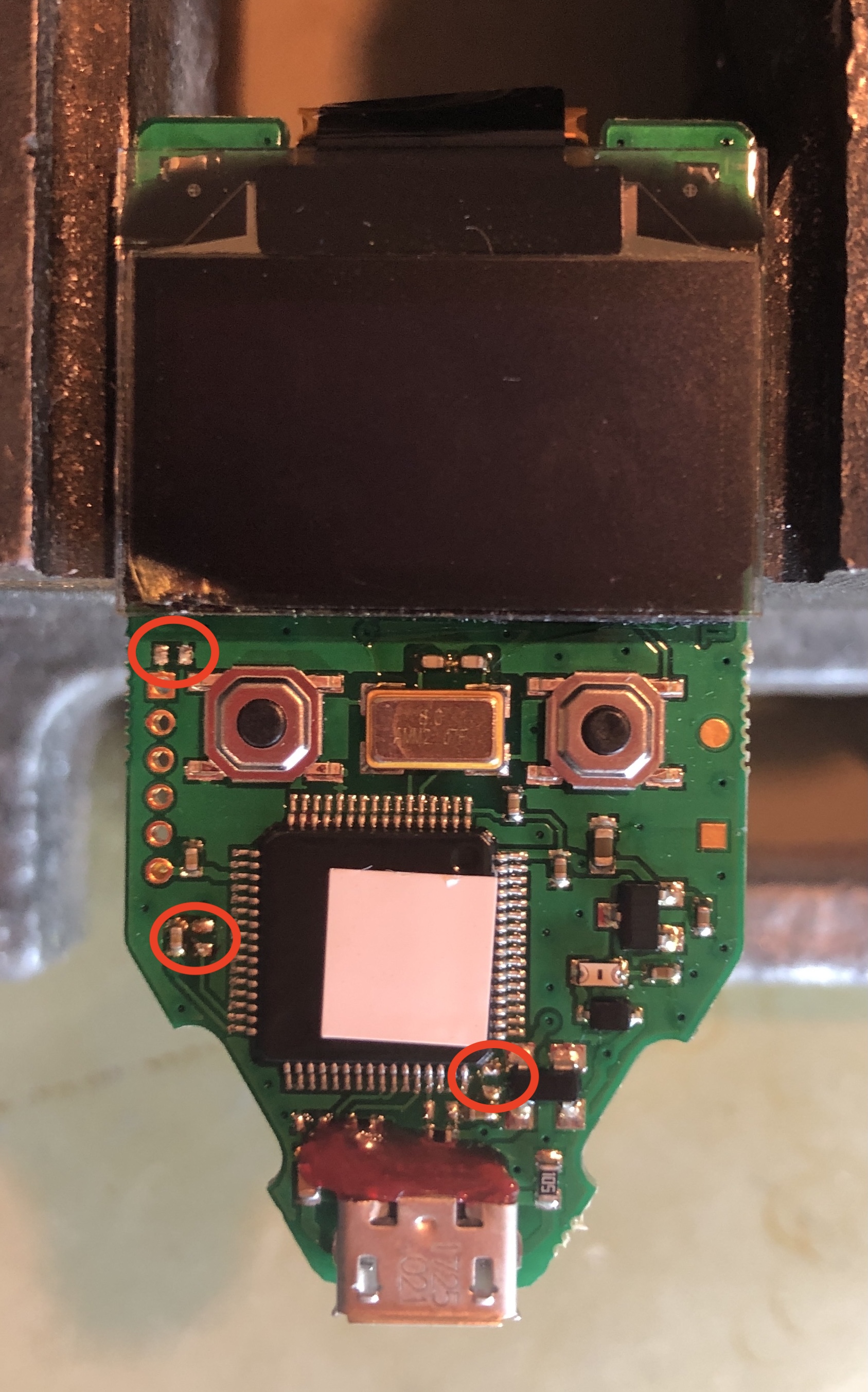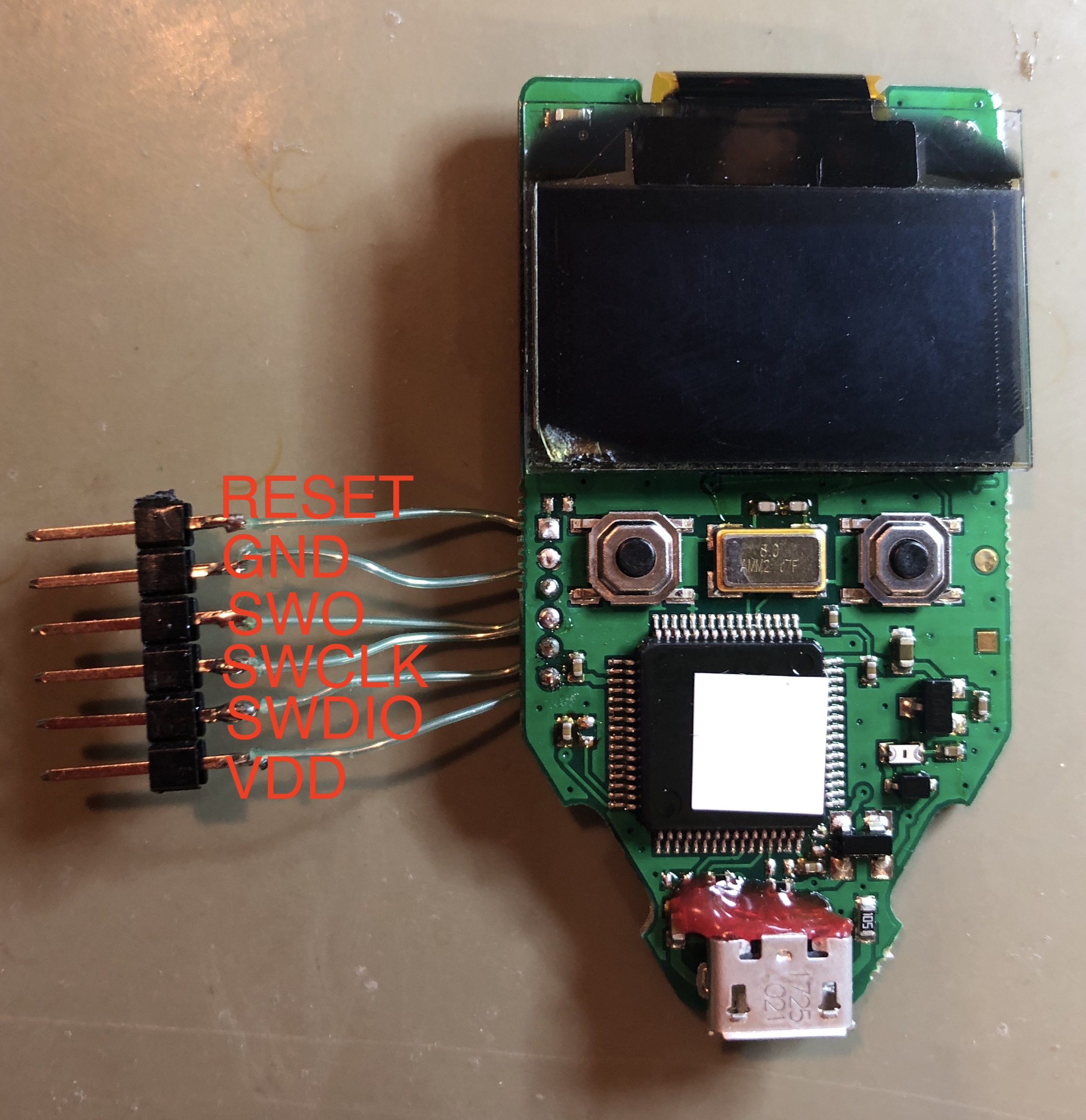 Then, a breakout pinheader is soldered to the Trezor One to get SWD access: