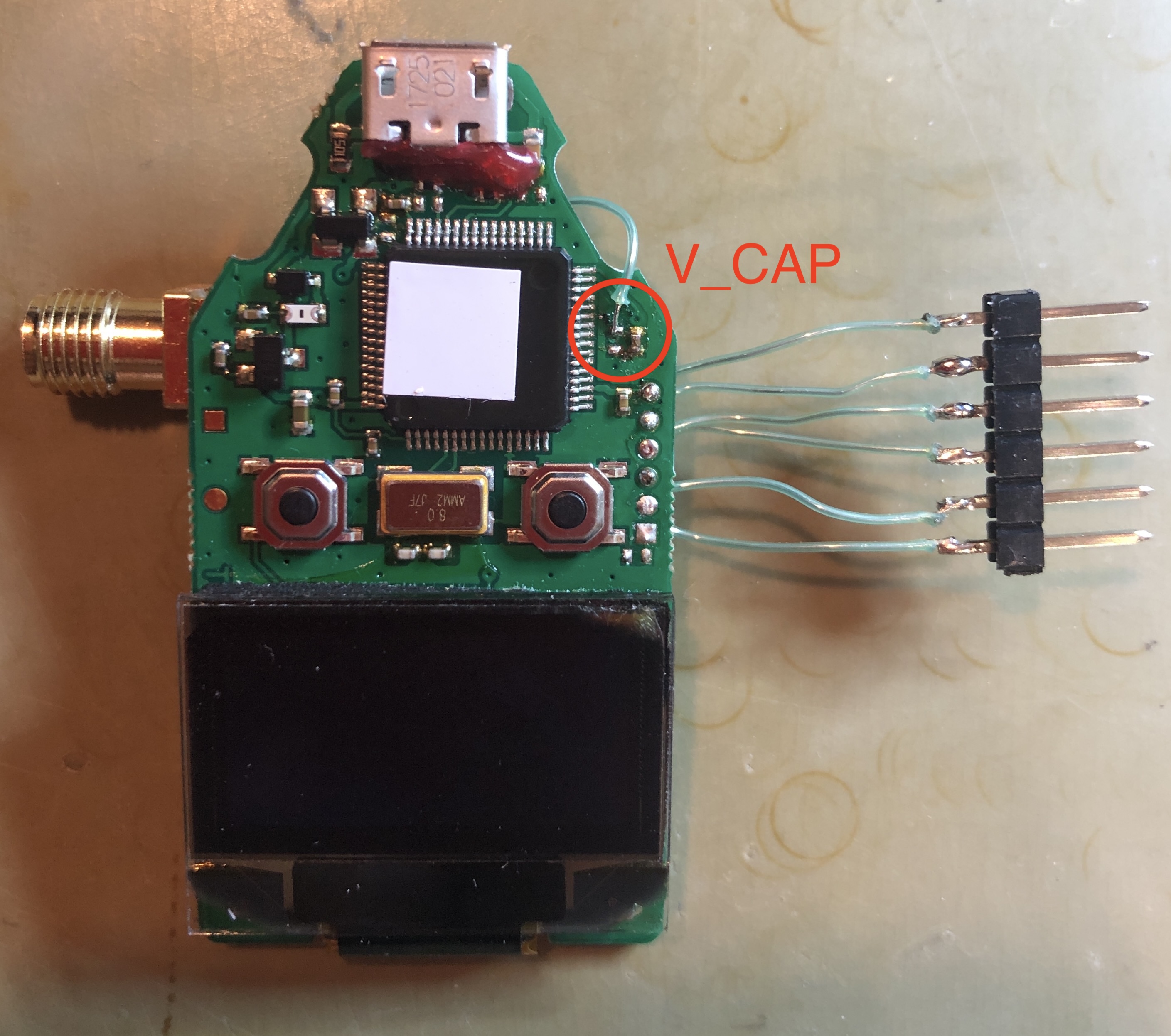 An SMA connector is glued to the backside of the device and connected the positive lead (middle pin) to the 'V_CAP' line and the negative lead to 'GND':