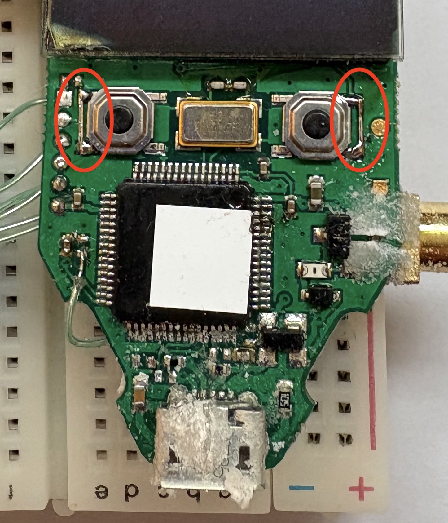 The two tactile switches are bridged. If the two buttons are pressed simultaneously, the Trezor One enters the bootloader mode for software updates. In this state, the recovery key is present in SRAM.