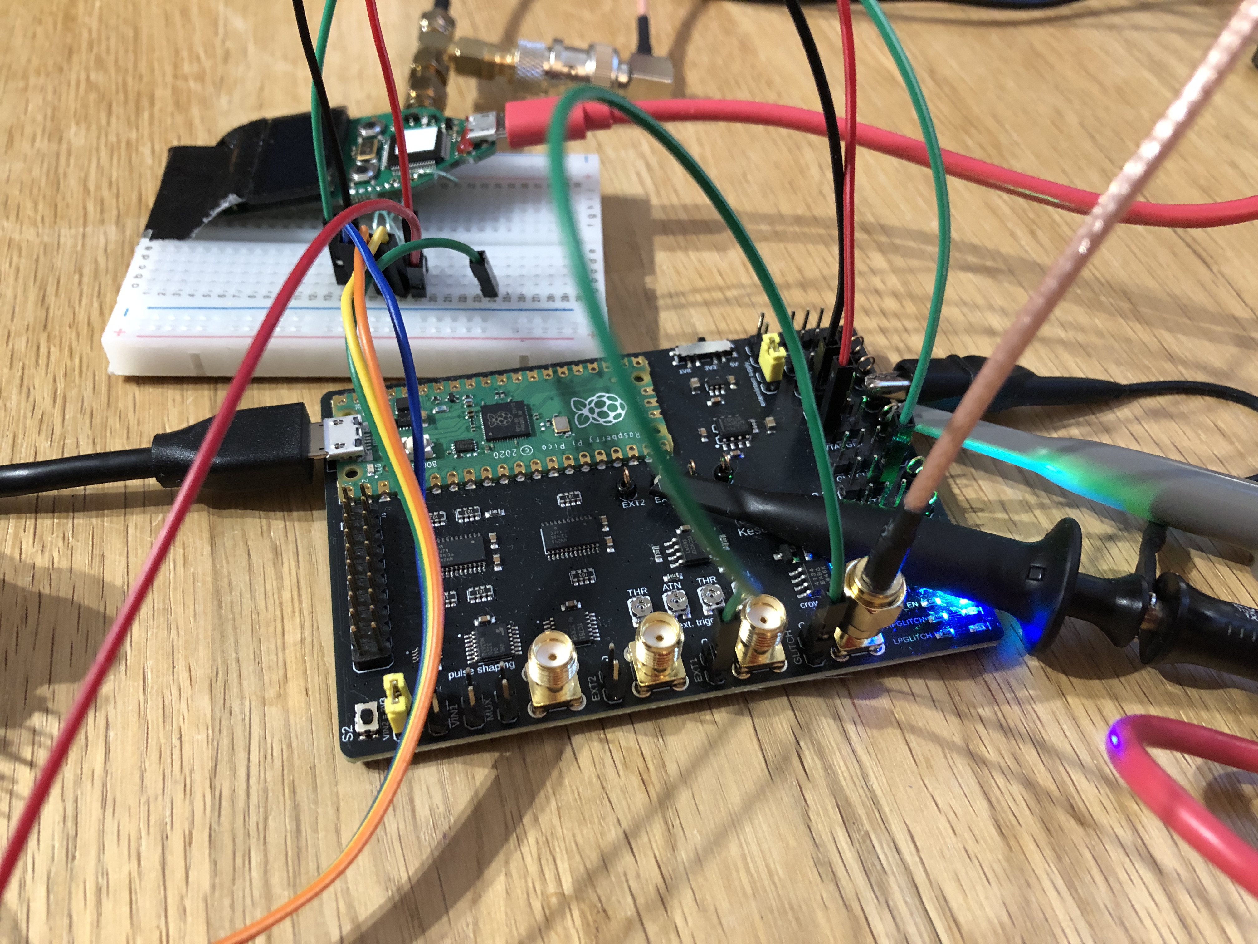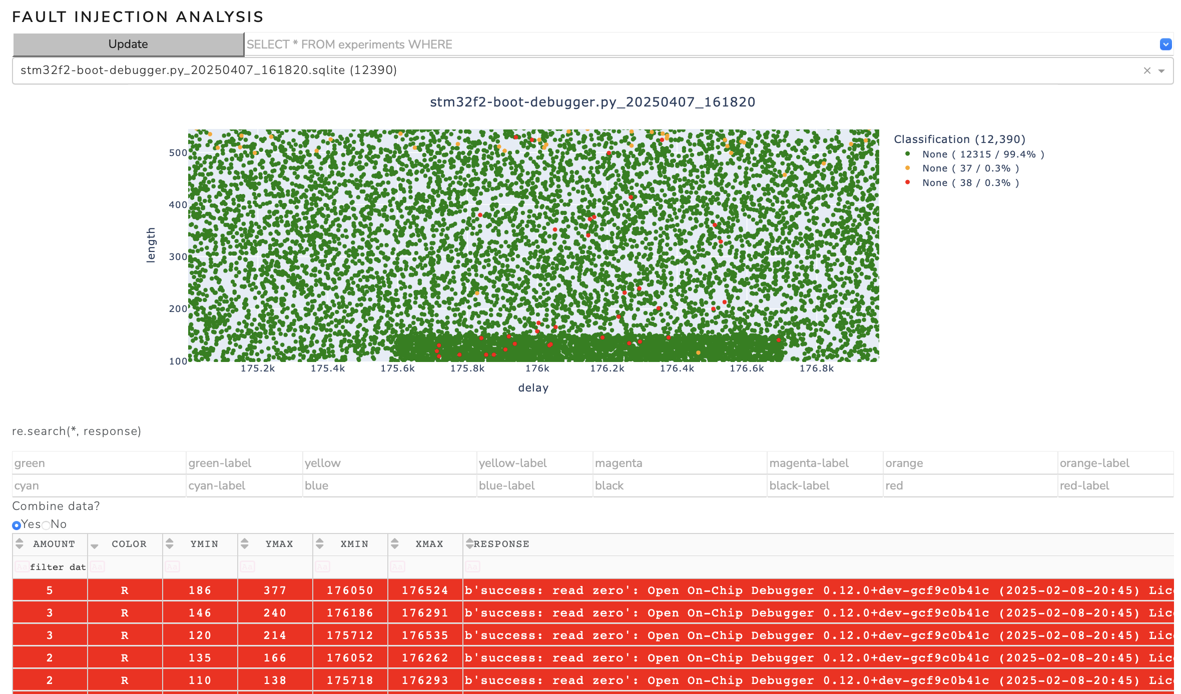 Now everything is set up, we can start glitching our device. For this, the script 'stm32f2-boot-debugger.py' has been prepared. This script powers up the device, waits for the trigger signal on input 'EXT1', waits a given delay and emits a glitch of a certain length. Afterwards, it is tested if memory can be read from RAM.